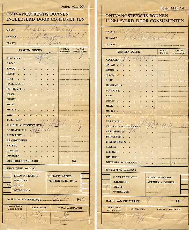 Drie ontvangstbewijzen voor het inleveren van distributiebonnen voor levensmiddelen. Een van de ontvangstbewijzen is ongebruikt.