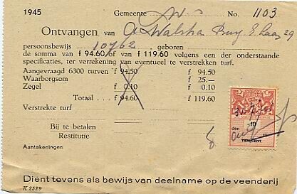 Ontvangstbewijs voor de verstrekking van turf. Met rood-wit zegel van tien cent. Het betreft aangevraagde turven voor de somma van Fl. 119,60.<br>