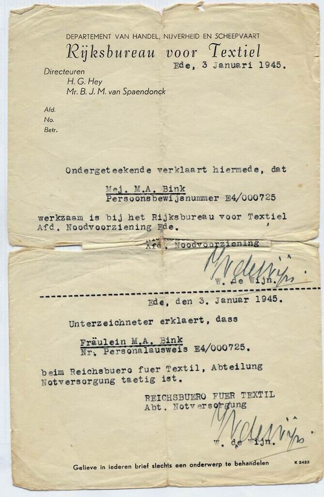 Verklaring dat Mej. Bink werkzaam is bij het Rijksbureau voor Textiel afdeling Noodvoorziening Ede. Opgesteld in Nederlands en Duits.
