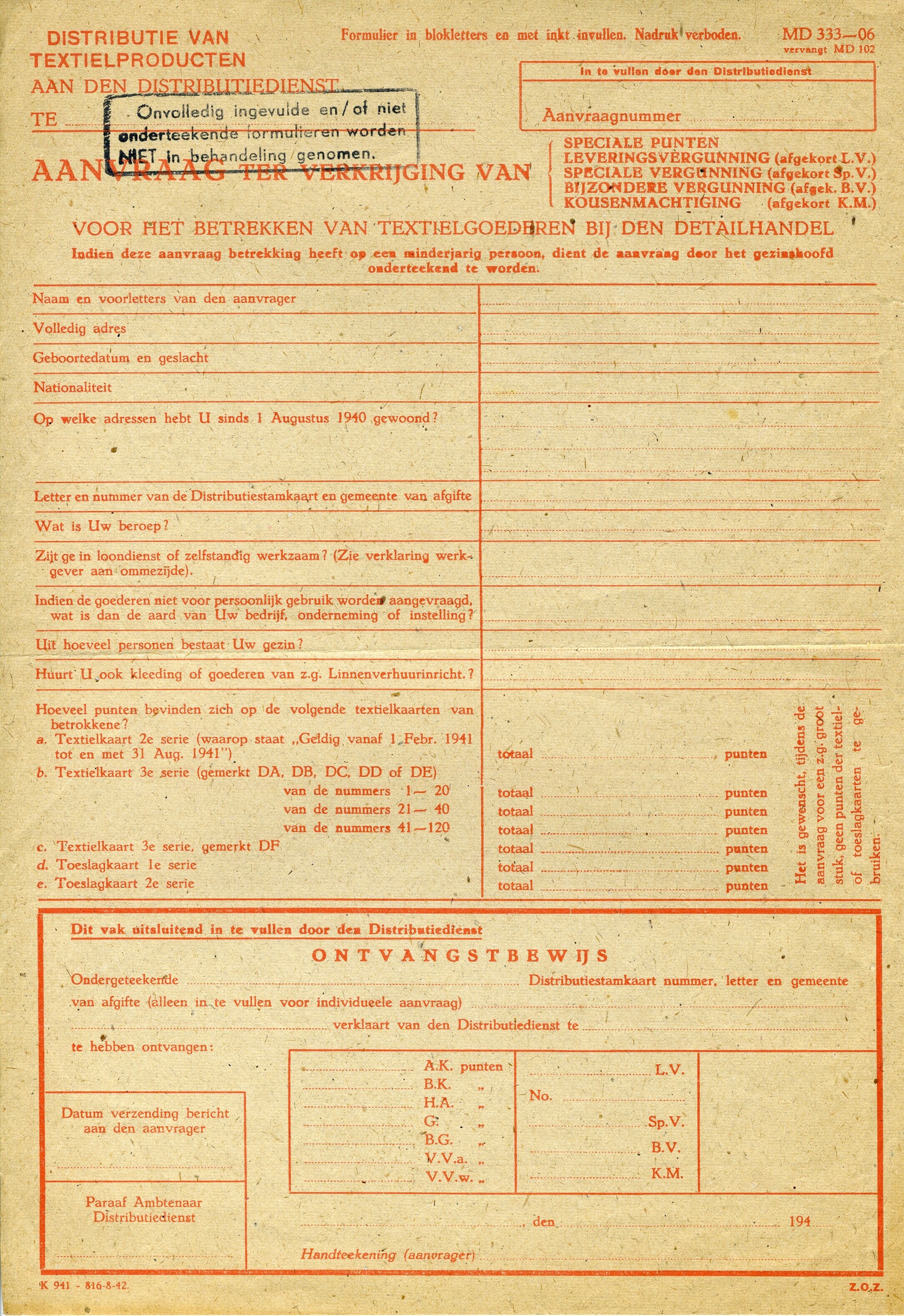 Twee blanco aanvraagformulieren (MD 333-06) in rode druk voor het verkrijgen van textielgoederen bij de detailhandel.