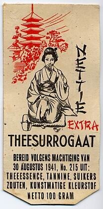 Kartonnen deel van een verpakking van theesurrogaat met een tekening van een pagode en Japanse theeschenkster. Volgens de opdruk bereid volgens machtiging van 30 augustus 1941.