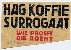 Uitgeknipt logo van HAG koffiesurrogaat met als rood gedrukt opschrift 'wie proeft die roemt'.