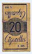 Sluitzegel van een sigarettenverpakking. In blauwe druk: 20 Cigarettes K 993.