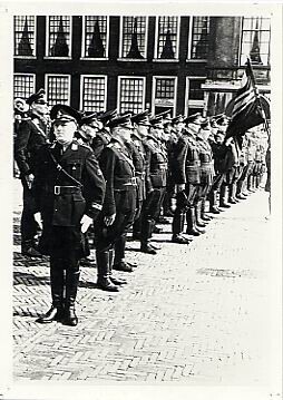 Een zwart-wit foto van een parade op het Binnenhof te Den Haag van N.S.B.'ers.<br>