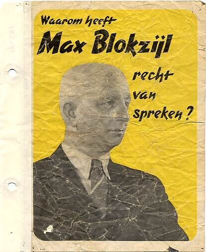 Het voorblad en in totaal 3 pagina's van een met zwart-wit foto's geïllustreerd propagandablad van de N.S.B. met de titel: "Waarom heeft Max Blokzijl recht van spreken?". Op het voorblad is tegen een gele achtergrond een zwart-wit foto van Max Blokzijl afgedrukt.