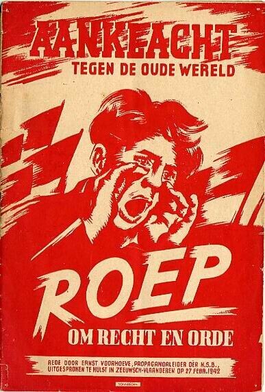 Een boek met de titel: "Aanklacht tegen de oude wereld. Roep om recht en orde" waarin een rede van Ernst Voorhoeve is weergegeven. Voorhoeve was propagandaleider van de N.S.B. De rede werd gehouden in Hulst op 27 februari 1942. Met op de omslag in rode opdruk de titel en een afbeelding van een roepende jongeman. Het boek telt 24 pagina's.