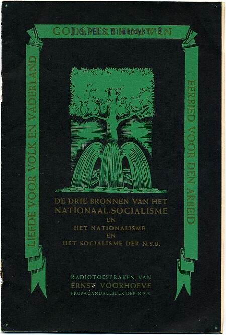 Een boekje met daarin opgenomen de radiotoespraken van Ernst Voorhoeve propagandaleider van de N.S.B. Hierin worden de drie bronnen van het Nationaalsocialisme en het nationalisme van de N.S.B. beschreven. Deze bronnen zijn: ''Godsvertrouwen, Liefde voor volk en vaderland, eerbied voor den arbeid." Het boekje telt 16 pagina's. Met zwarte omslag waarop in groen gedrukt een tekening van een boom en drie waterbronnen omgeven door een lint waarop de drie ideologische bronnen staan vermeld.