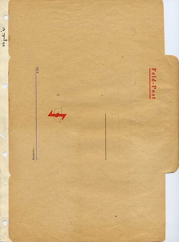 Duits militair postblad met ruimte voor adressering. Op het blad staat in rood gedrukt: "Feld-Post" en de afbeelding met zwarte lijntekening van een Duitse helm met daaroverheen en rode Wolfsangel. Het nog onbeschreven postblad kan worden dubbelgevouwen en gesloten worden met een flap met een lijmrand.