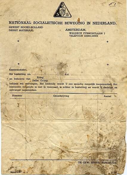 Een oningevuld formulier waarop de bevestiging van een bestelling ten behoeve van een N.S.B.-Kring of zelfstandige groep kan worden genoteerd. Het formulier is van de "Dienst Materiaal, Gewest Noord-Holland". Bovenaan het driehoekig logo van de N.S.B.<br>