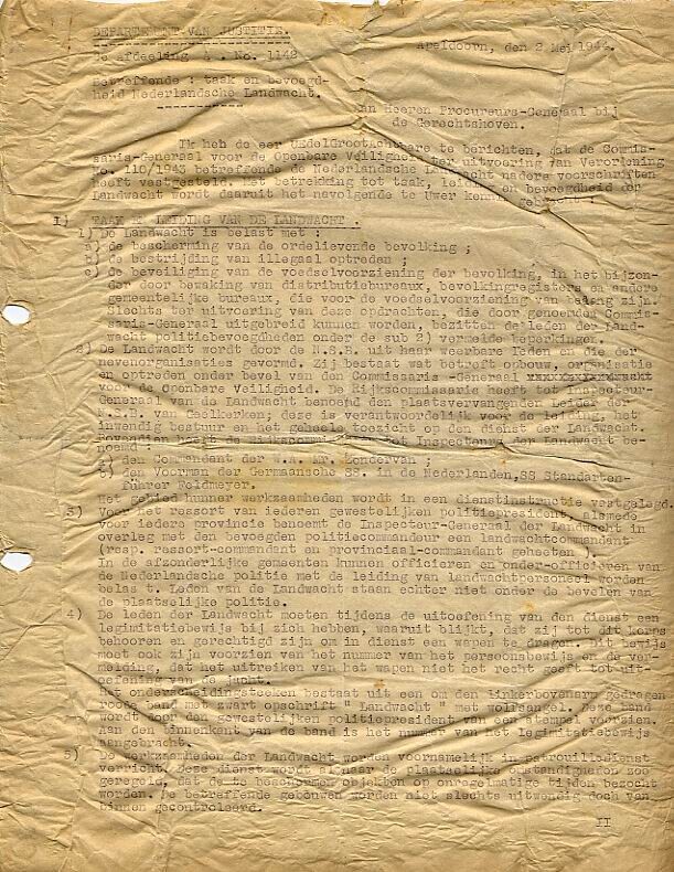 Kopie van een brief over de taak en bevoegdheid van de Nederlandsche Landwacht van 2 mei 1944, gericht aan de Procureurs-generaal bij de Gerechtshoven.