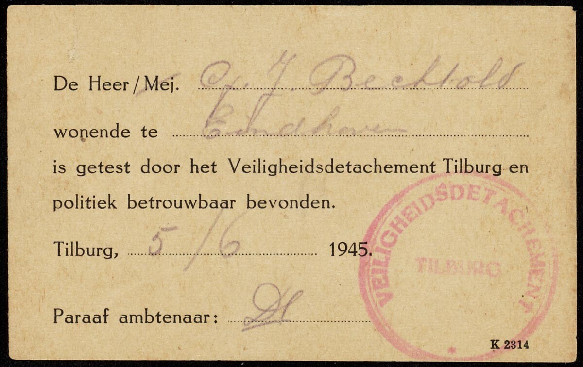 Document van het veiligheidsdetachement Tilburg ter verklaring van politieke betrouwbaarheid van G.J. Bechtold.