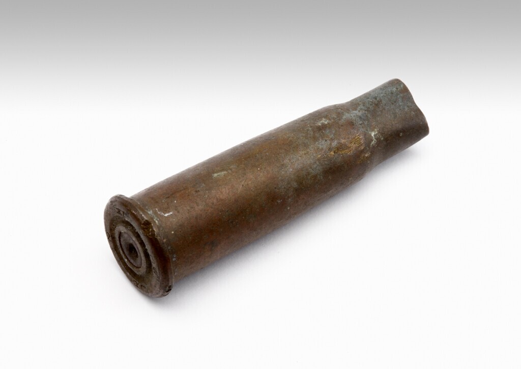 Een Franse koperen kogel. In de onderkant gestanst: LM-LM 2-39.