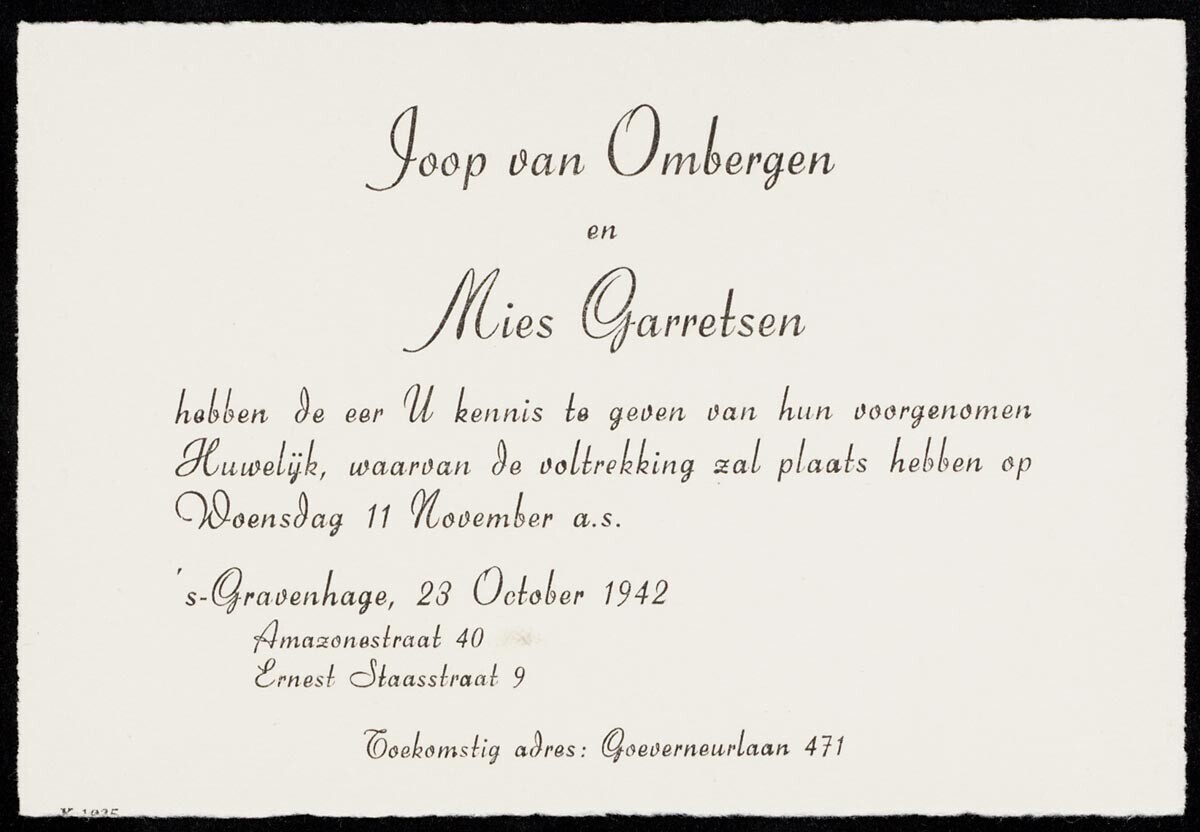 Huwelijksaankondiging van dhr. J. van Ombergen met mej. M. Garretsen. Met enveloppe.
