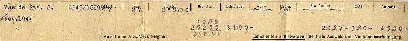 Loonstrook van Auto Union A.G. van november 1944 van de heer J. van de Pas die in Duitsland te werk gesteld was.