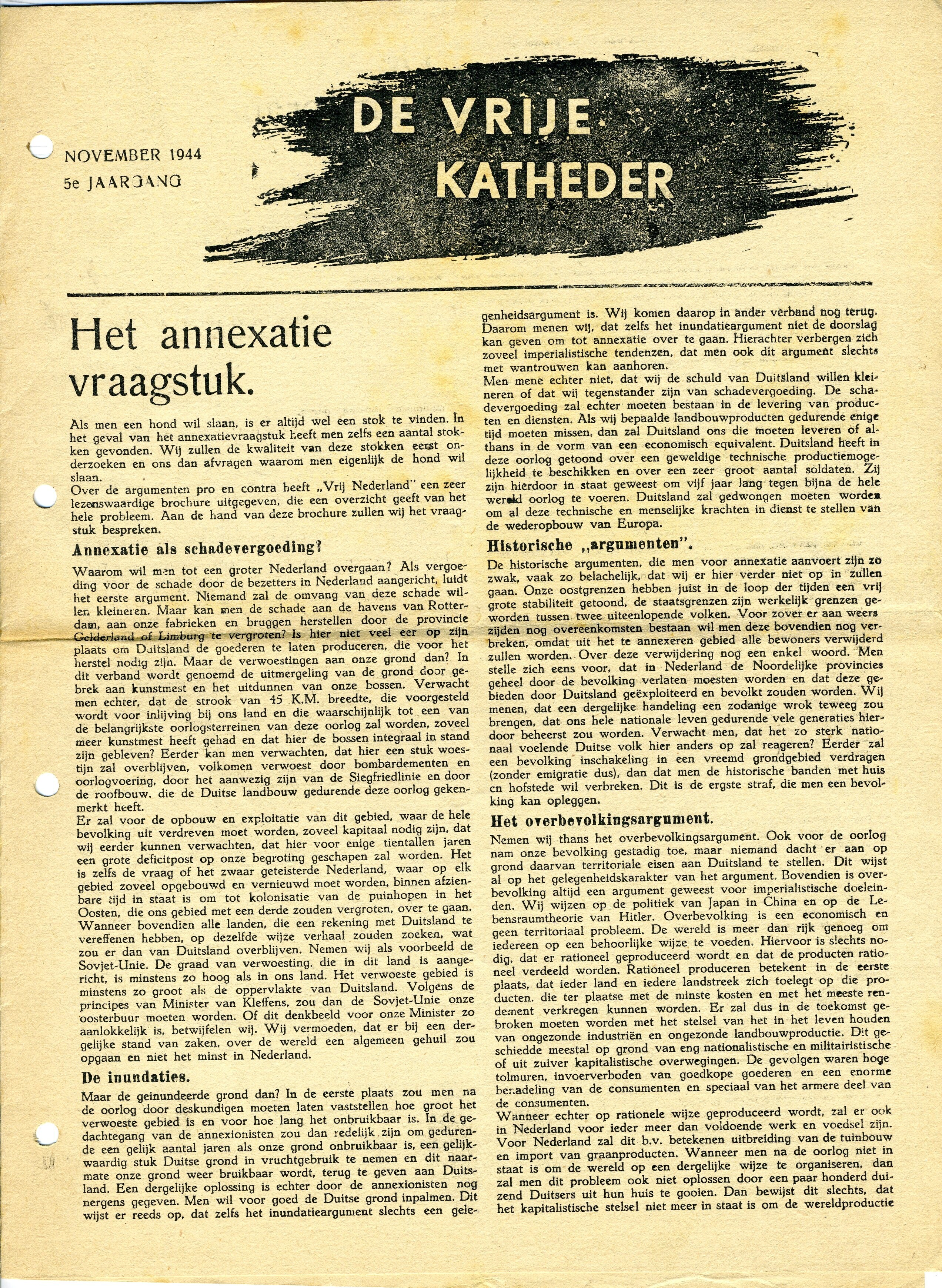 Twee exemplaren van de verzetsbladen "De Vrije Katheder''. Het betreft jaargang 5 de edities van november en december 1944. De exemplaren zijn meerbladig en van verschillend formaat. <br><br><br><br>