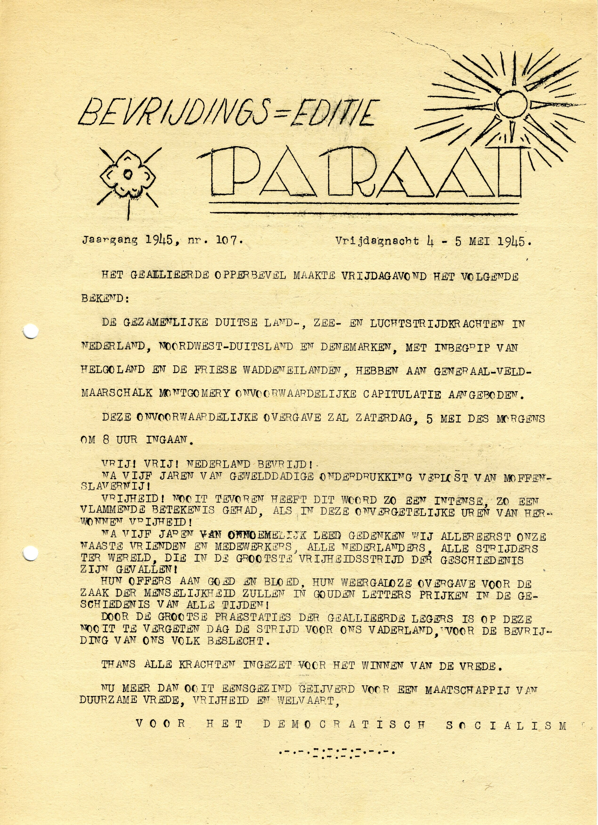 Gestencilde bevrijdingseditie van "Paraat", jaargang 1945, nummer 107, waarin de bevrijding van Nederland wordt bekendgemaakt. Op de achterzijde "Tien geboden voor thans" over hoe te handelen na de bevrijding.