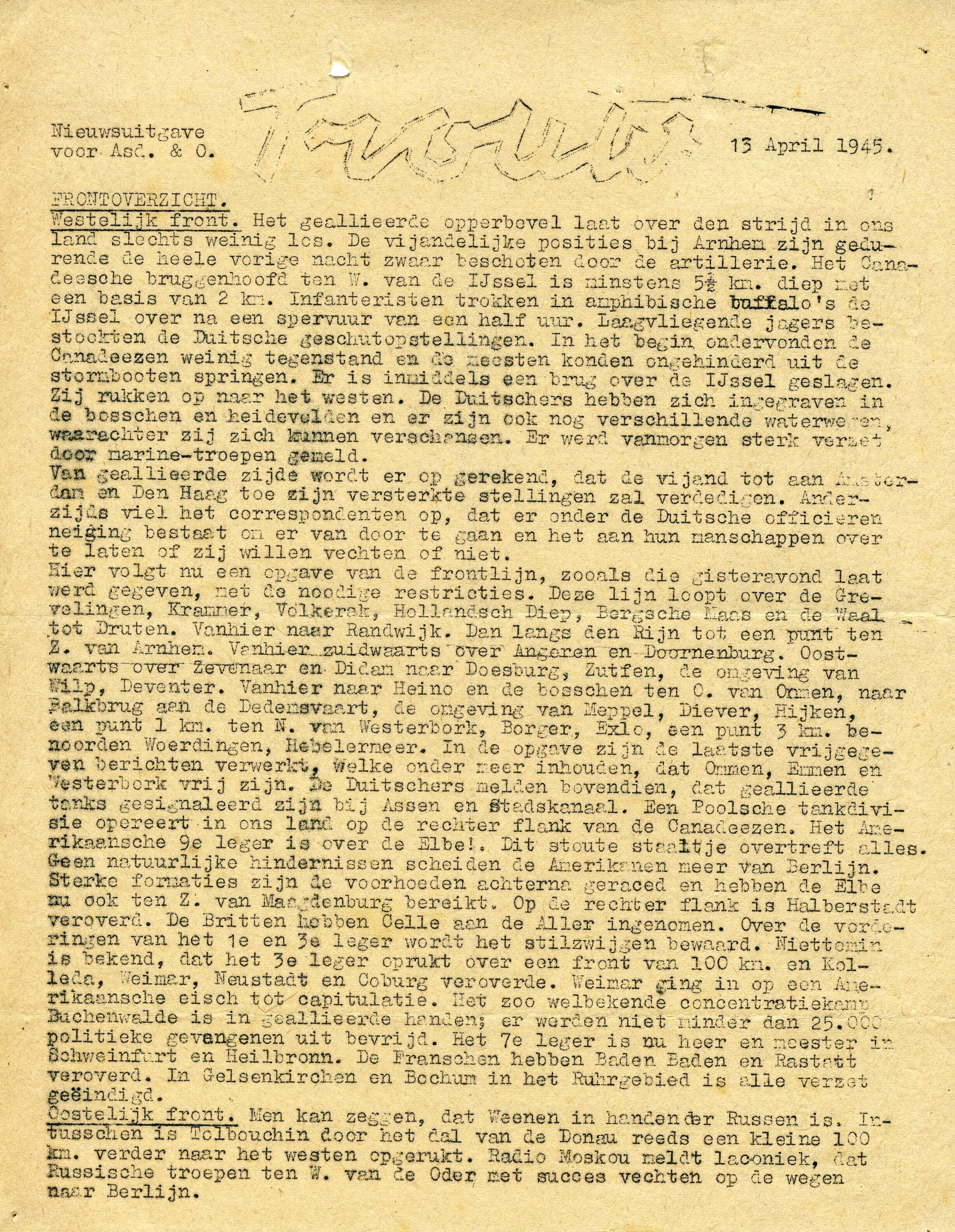 Drie gestencilde dubbelzijdige nieuwsuitgaven van Trouw van 13 april 1945, met onder andere beschrijvingen van de gebeurtenissen aan het westelijk en oostelijk front.