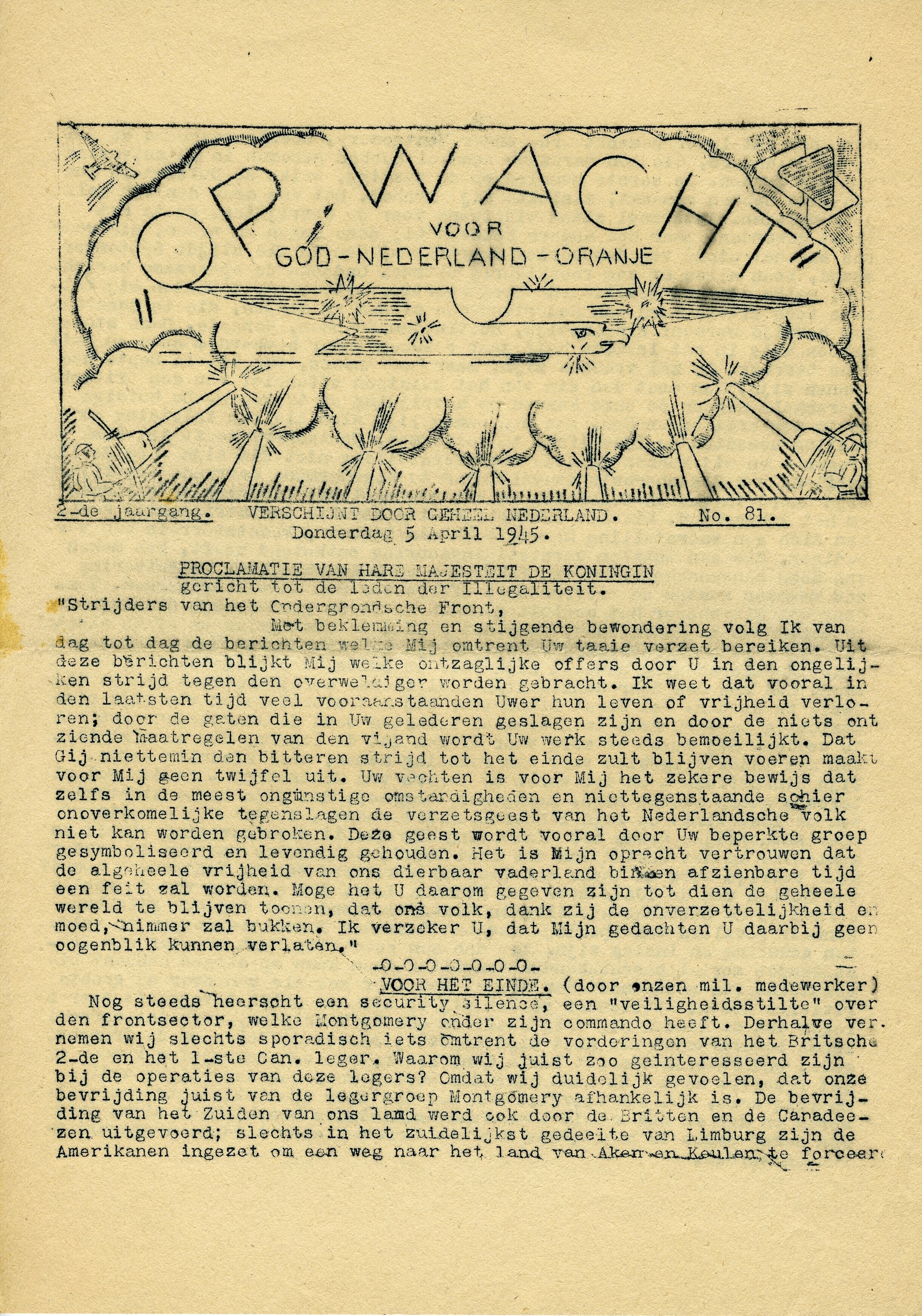 Twee exemplaren van "Op wacht". Het betreft de tweede jaargang, de nummers 81 (5 april 1945) en 85 (2 mei 1945). Op de voorzijde het getekende logo van een vliegende adelaar die wordt beschoten met kanonnen. De editie van 5 april omvat twee pagina's met een proclamatie van de koningin. De editie van 2 mei omvat vier pagina's en is onder andere gewijd aan de onvoorwaardelijke capitulatie van Duitsland.<br><br>
