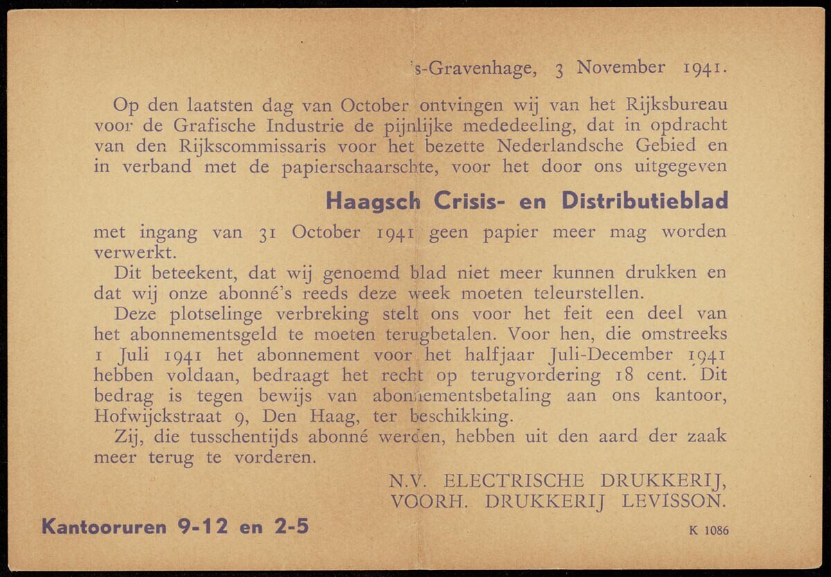 Rondschrijven van N.V. Electrische Drukkerij dat geen papier meer mag worden verwerkt voor het Haags Crisis en Distributieblad. wegens schaarste.