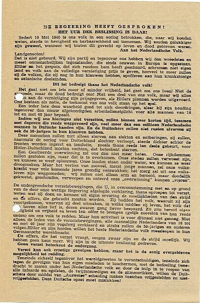 Bulletin van 'De gezamenlijke verzetsbeweging in Nederland' van 5 januari 1945. In het bulletin wordt gewaarschuwd voor de arbeidsinzet.