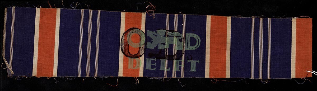 Twee mouwbanden met een gestreept patroon in de kleuren rood, wit en blauw met opdruk "OD Delft" en de afbeelding van de Nederlandse leeuw.<br><br>