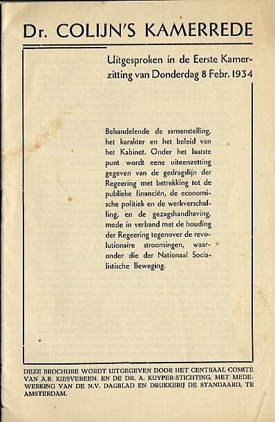 Rede uitgesproken door Dr. Colijn in de Eerste Kamer op 8 februari 1934 o.a. over de gedragslijn van de regering ten opzichte van revolutionaire stromingen waaronder de Nationaal Socialistische Beweging.