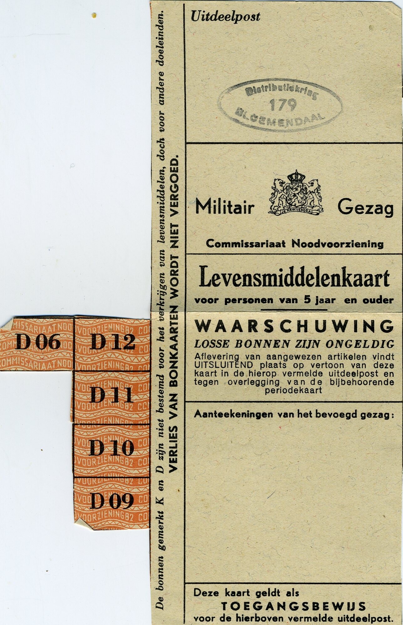 Bonkaart levensmiddelen uitgegeven door het Militair Gezag, Commissariaat Noodvoorziening. Met stempel van de distributiekring 179, Bloemendaal