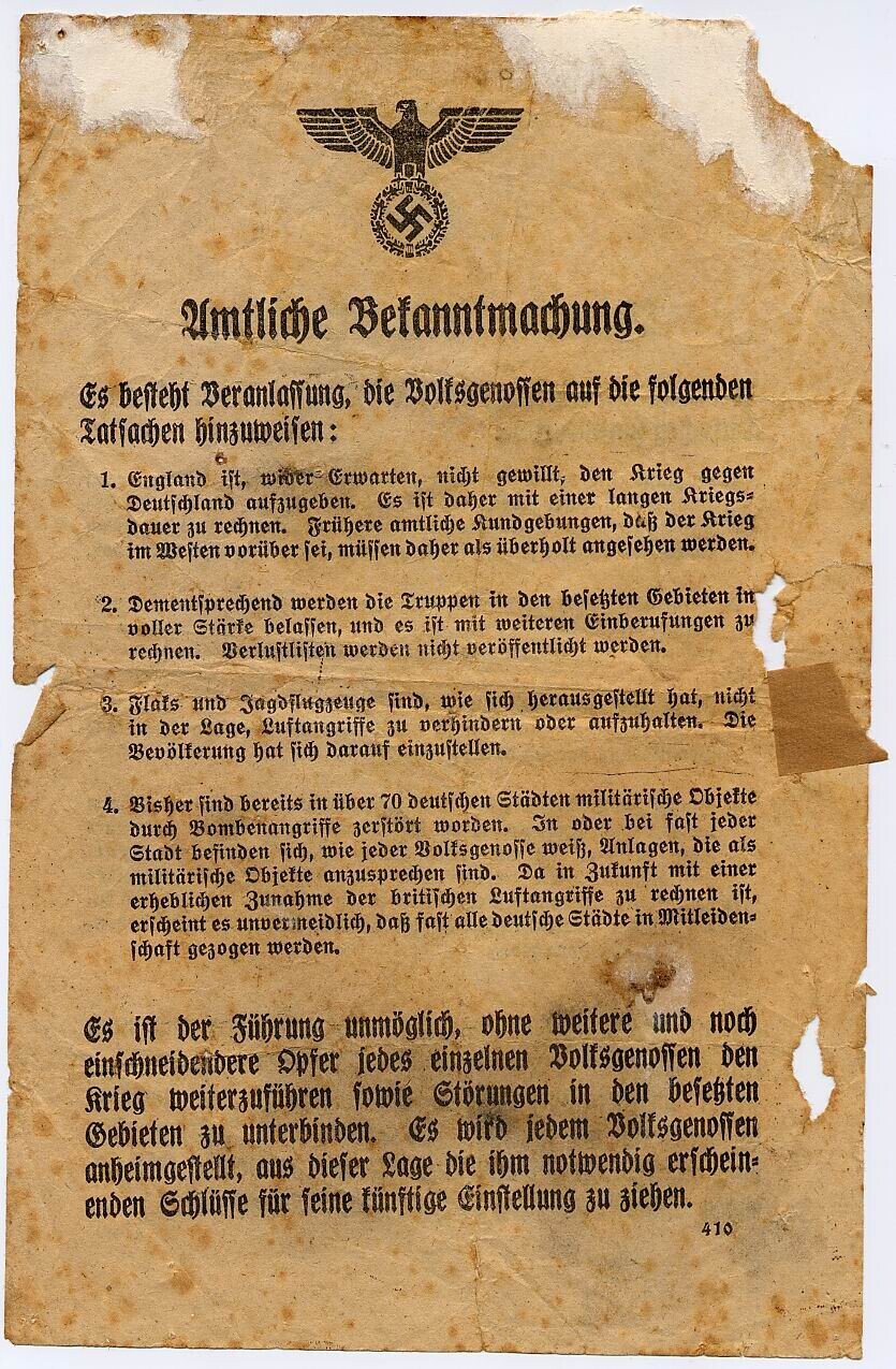 Geallieerd (Duitstalig) pamflet waarin de Duitsers worden gewaarschuwd voor de offers die gebracht zullen moeten worden bij voortzetting van de oorlog. Het pamflet is aan beide kanten bedrukt met dezelfde tekst. Bovenaan de Duitse rijksadelaar met hakenkruis.