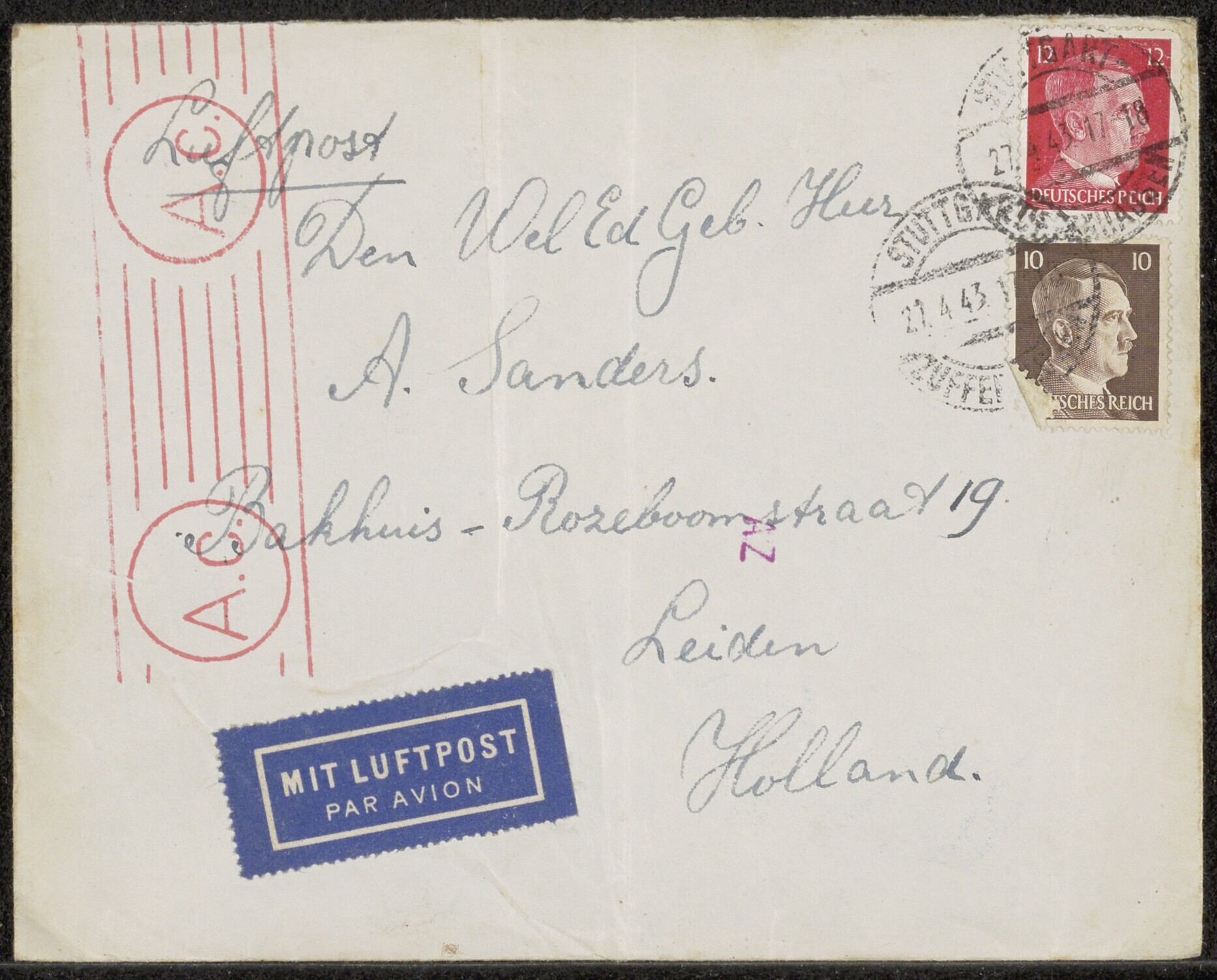 Luchtpostbrief uit Duitsland. In de brief doet de schrijver verslag over onder andere zijn werkzaamheden als ''machine arbeiter'' in de fabriek in Stuttgart. De enveloppe is voorzien van twee postzegels met de afbeelding van Hitler en een blauw luchtpostzegel.