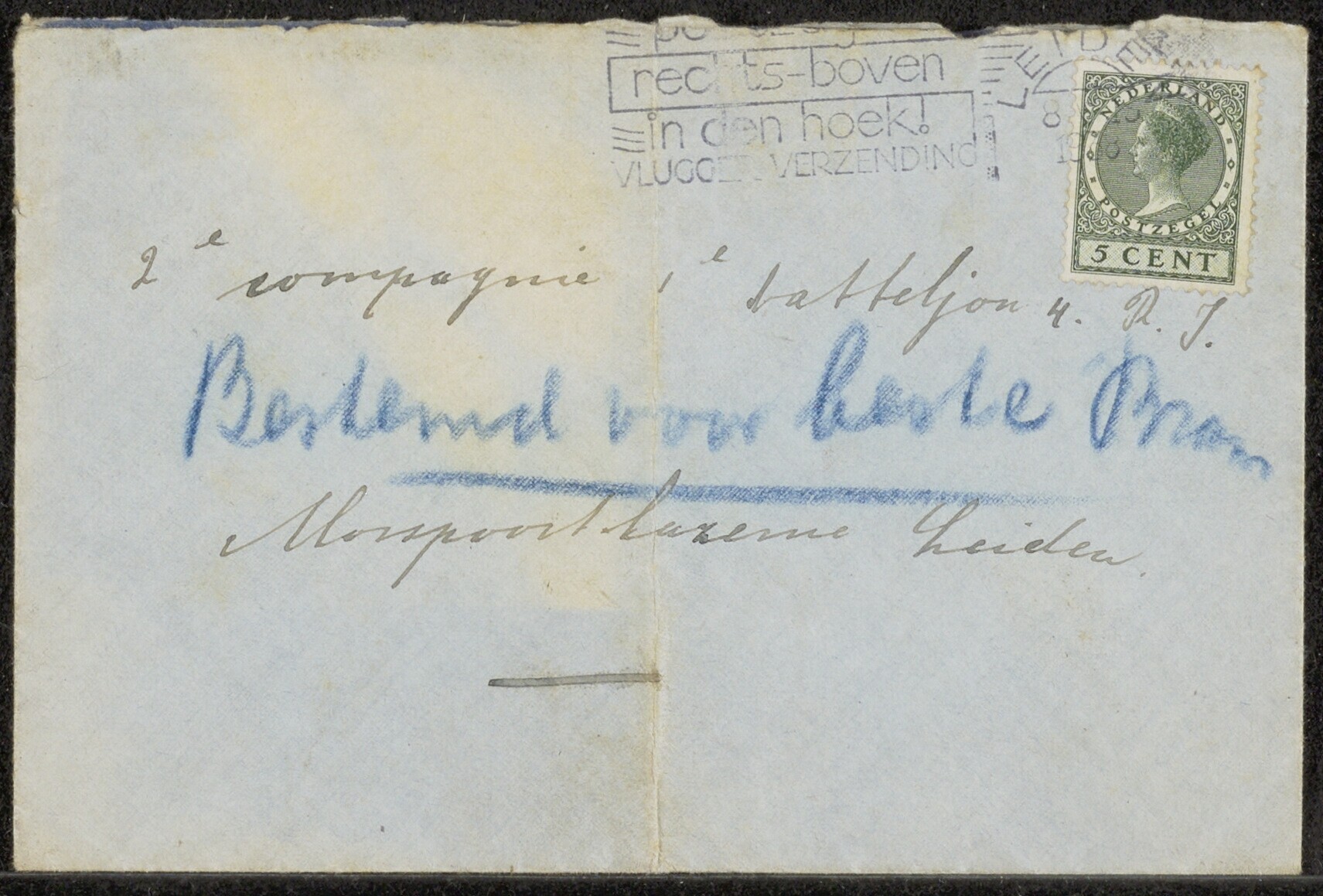 Lichtblauwe brief met op de enveloppe een postzegel van Koningin Wilhelmina. De brief is gericht aan de ''2e Compagnie 1e batteljon 4, R.J., Morspoortkazerne Leiden''. Op de enveloppe is met blauw potlood geschreven "voor beste Bram".