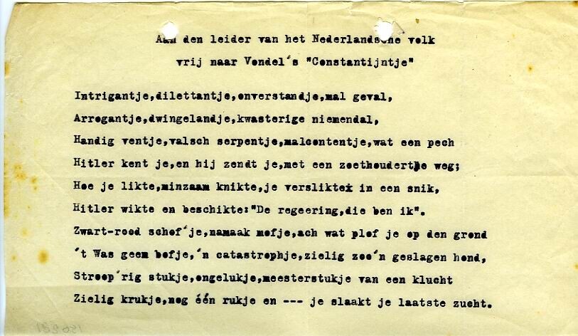 Getypt spotgedicht op Mussert "Aan den leider van het Nederlandsche Volk. <br>Intrigantje, dilettantje, onverstandje, mal geval,<br>Arrogantje, dwingelandje, kwasterige niemendal,<br>Handig ventje, vlasch serpentje, malcontentje, wat een pech<br>Hitler kent je, en hij zendt je, met een zoethoudertje weg;<br>Hoe je likte, minzaam knikte, je verslikte in een snik,<br>Hitler wikte en beschikte: "De regeering, die ben ik".<br>Zwart-rood schof'je, namaak mofje, ach wat plof je op den grond<br>'t Was geen bofje, 'n catastrophje, zielig zoo'n geslagen hond,<br>Streep'rig stukje, ongelukje, meesterstukje van een klucht<br>Zielig krukje, nog één rukje en ... je slaakt je laatste zucht.<br>(vrij naar Vondel's 'Constantijntje')"