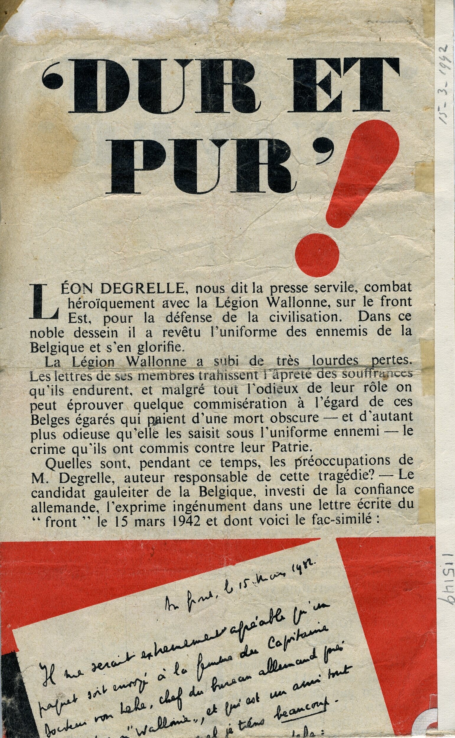 Geallieerd (Franstalig/Nederlandstalig) pamflet waarin bericht wordt over de, aan het Oostfront gelegerde, Belgische Rexistenleider Léon Degrelle. Degrelle zou op 15 maart 1942 een brief hebben verstuurd waarin hij verzocht om een pakket schaarse levensmiddelen op te sturen naar de, in Duitsland verblijvende, vrouw van een Gestapo-officier.