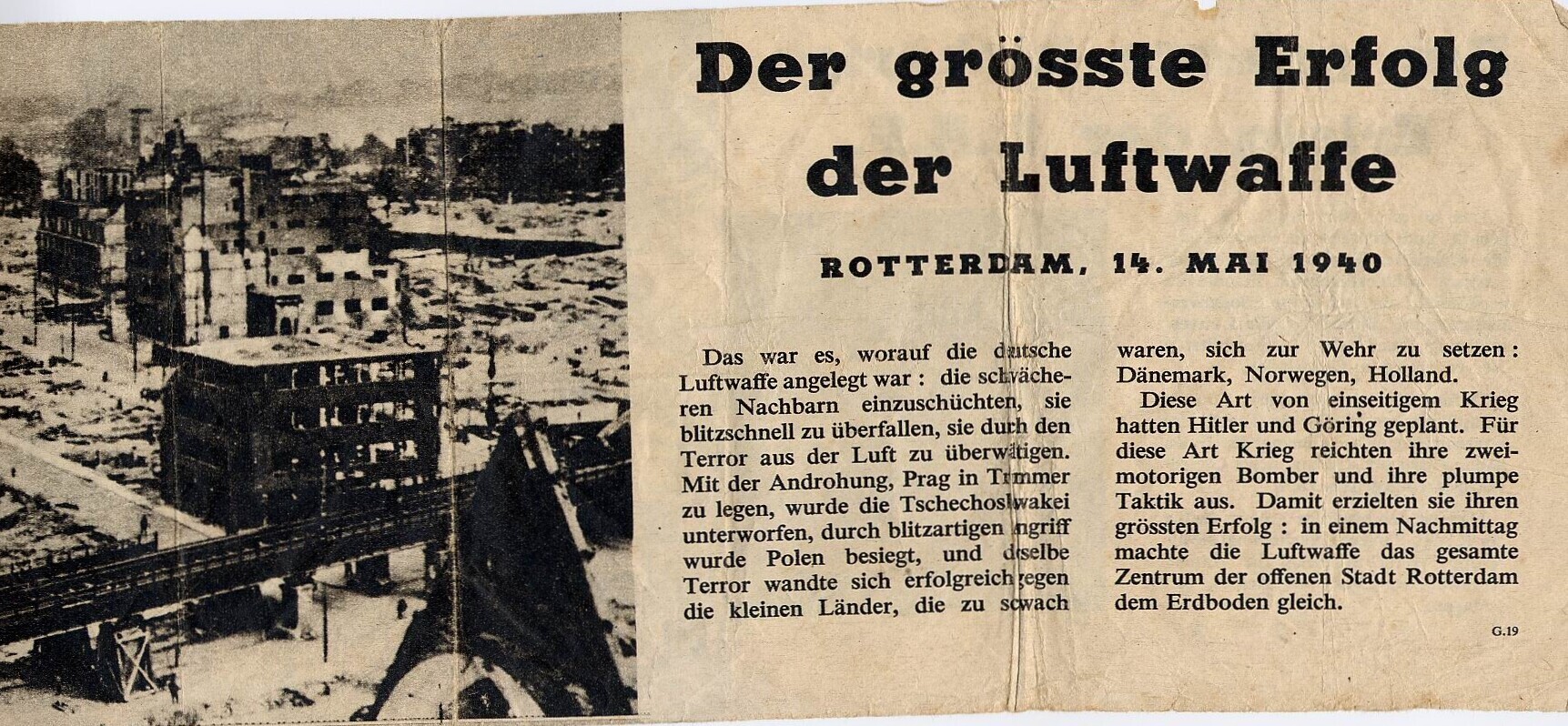 Geallieerd (Duitstalig) pamflet waarin het Duitse bombardement van Rotterdam op 14 mei 1940 wordt vergeleken met het Britse bombardement van de Krupp-fabrieken in Essen op 5 en 12 maart 1943.