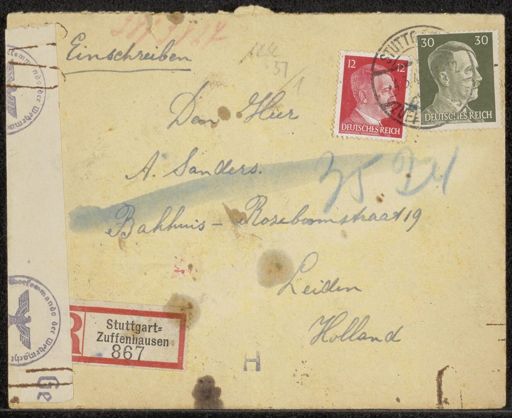 Brief uit Duitsland voorzien van twee postzegels van Hitler, en een rood-wit zegel: Stuttgart- Zuffenhausen. Langszij een strip met twee Wehrmachtstempels met de melding dat de enveloppe is geopend.