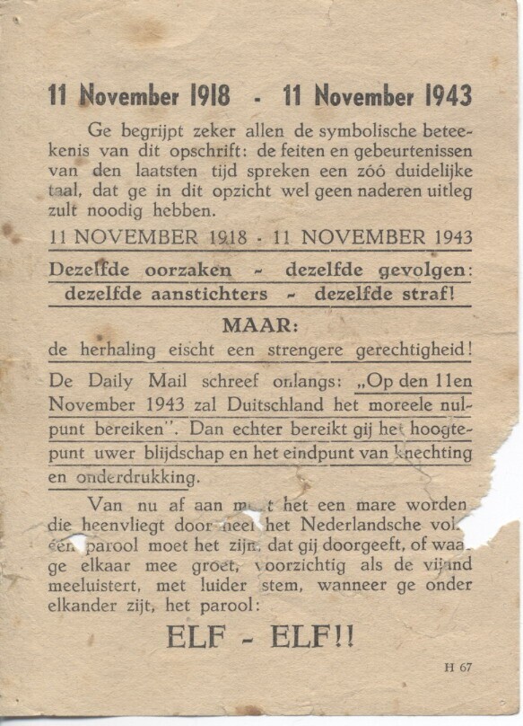 Nederlandstalig pamflet waarin, met verwijzing naar de Duitse wapenstilstand tijdens de Eerste Wereldoorlog op 11 november 1918, de hoop wordt uitgesproken dat in november 1943 de oorlog beëindigd zal zijn.