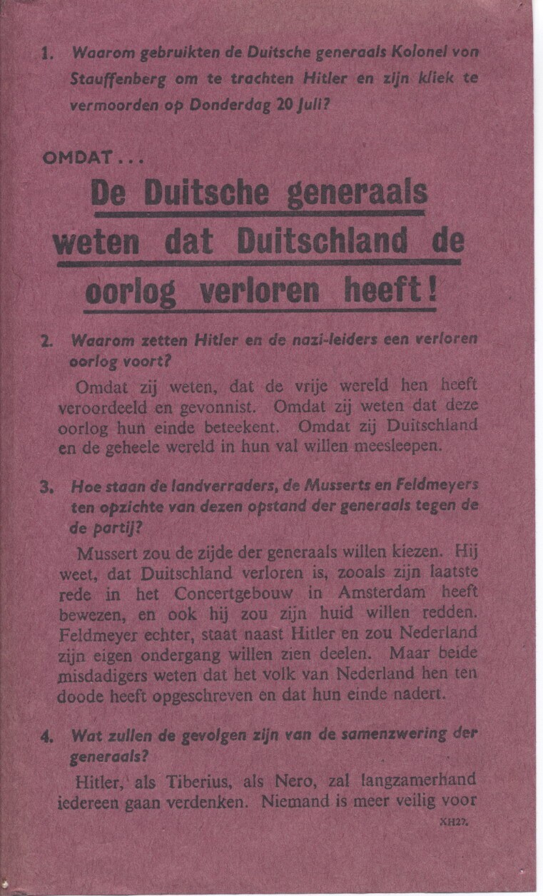 Geallieerd (Nederlandstalig) pamflet waarin de achtergronden en gevolgen van de aanslag op Hitler door Kolonel von Stauffenberg worden besproken. het strooibiljet is verspreid door de geallieerde luchtmacht.