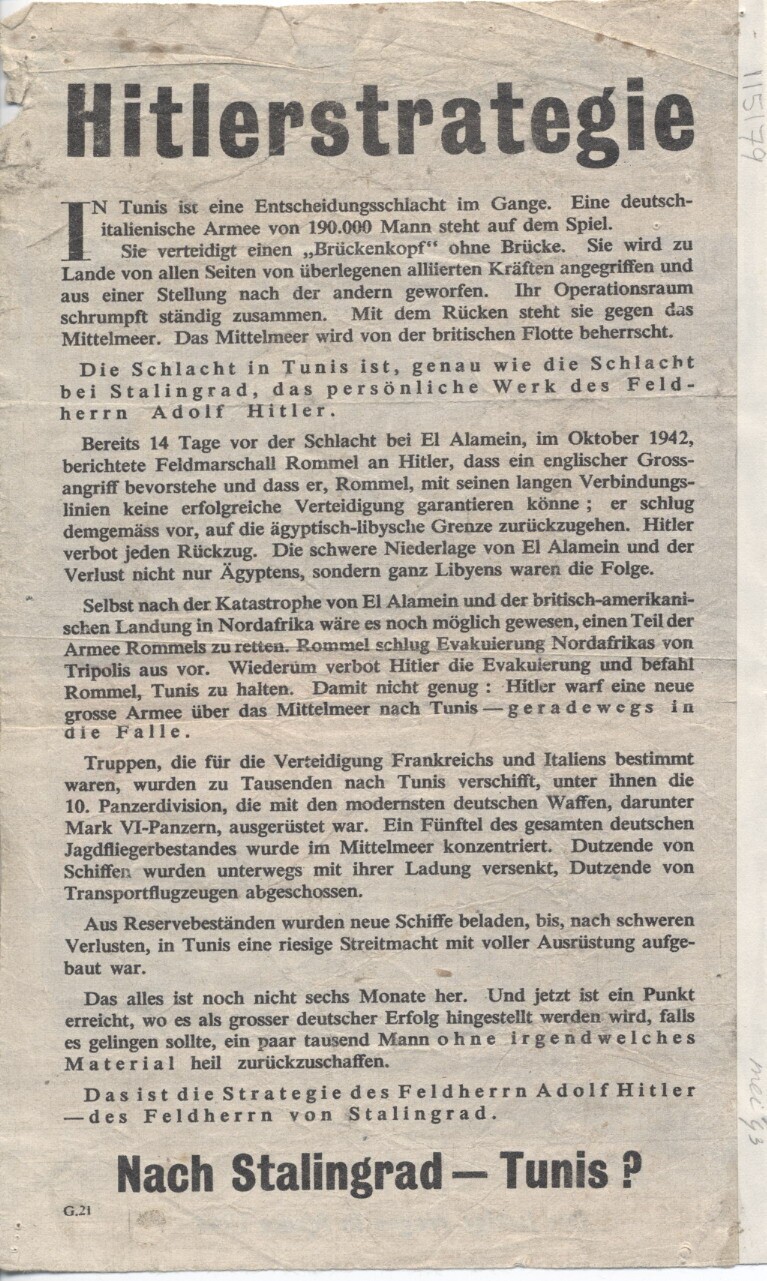 Geallieerd (Duitstalig) pamflet waarin Hitlers militaire strategie wordt bekritiseerd.
