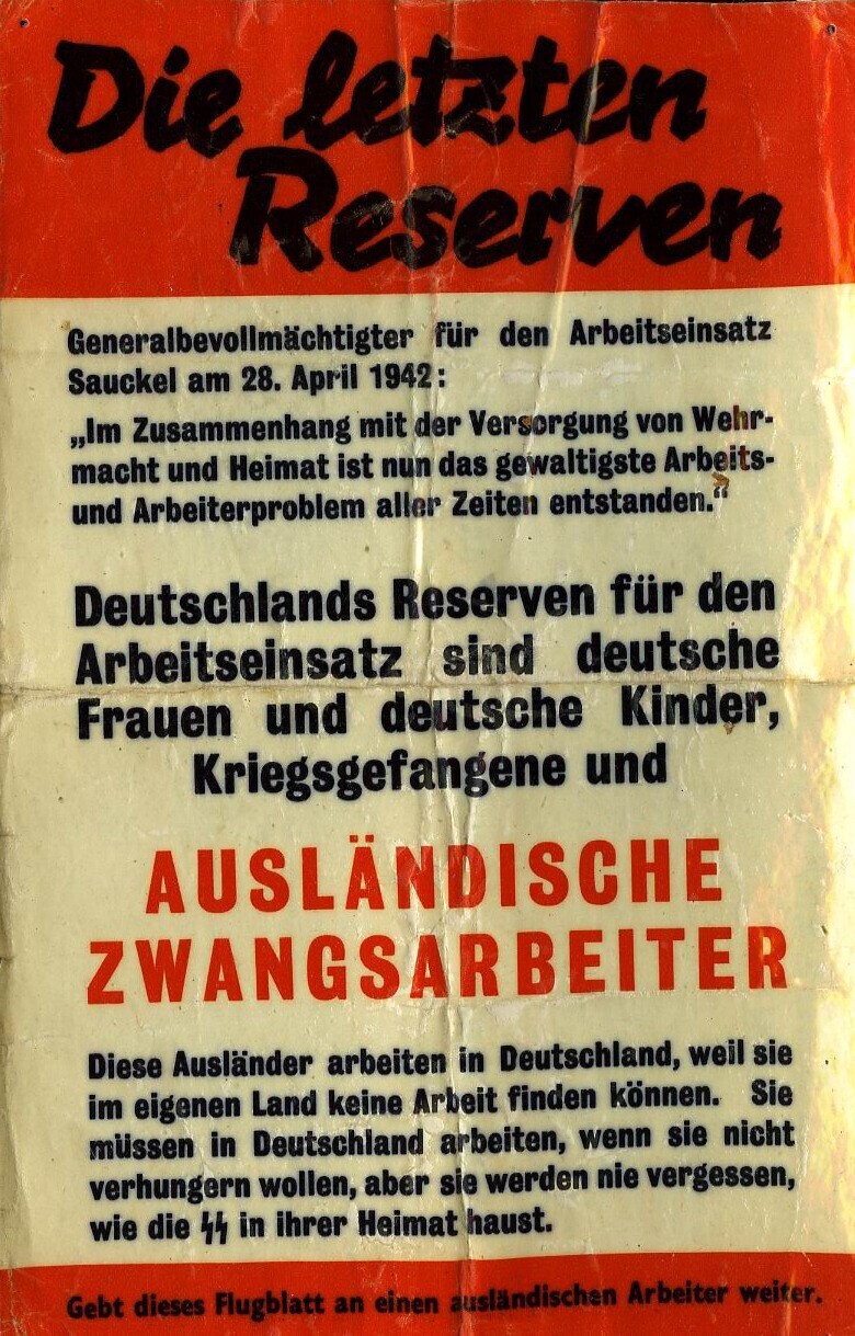 Geallieerd pamflet in vijf talen (Duits, Frans, Pools, Tsjechisch en Nederlands) waarin buitenlandse dwangarbeiders worden opgeroepen om de Duitse oorlogsindustrie te saboteren.