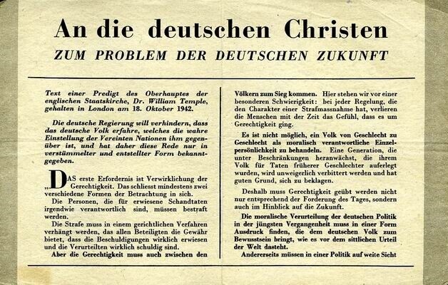 Geallieerd (Duitstalig) pamflet waarin de aartsbisschop van Canterbury zijn mening geeft over de geallieerde naoorlogse politiek met betrekking tot Duitsland en de Duitsers.