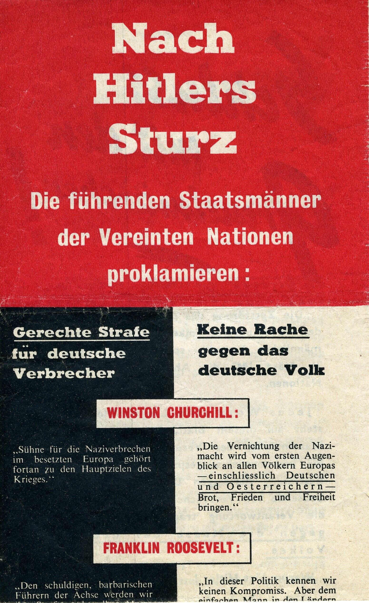 Twee exemplaren van en geallieerd (Duitstalig) pamflet waarin de Duitsers wordt voorgehouden dat de geallieerden er niet op uit zijn om wraak te nemen op het Duitse volk, maar slechts de nazi-leiders willen bestraffen.