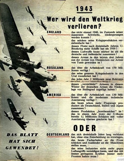 Geallieerd (Duitstalig) pamflet. Op de voorzijde wordt de vraag gesteld welk land verantwoordelijk is geweest voor het uitbreken van de oorlog. Op de achterzijde wordt de vraag gesteld welk land waarschijnlijk de oorlog zal gaan verliezen.