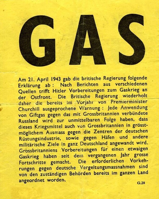 Geallieerd (Duitstalig) pamflet waarin de Britse regering Hitler waarschuwt om geen gifgas aan het Oostfront te gebruiken omdat de Britten in dat geval zelf ook gifgas zullen gebruiken tegen de Duitsers.