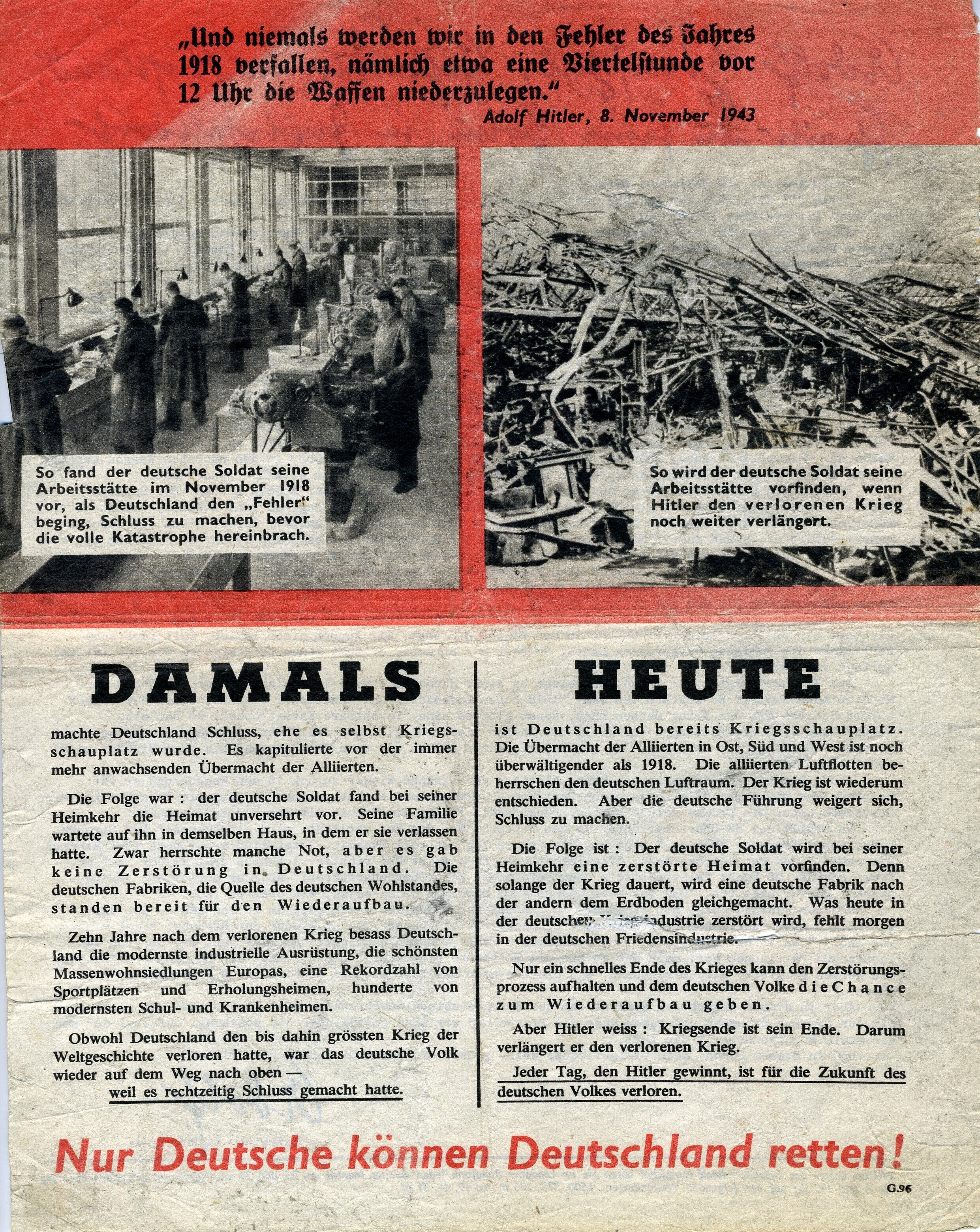 Geallieerd (Duitstalig) pamflet met op de voorzijde een fictieve brief van een Duitse soldaat aan het Oostfront. Op de achterzijde wordt een vergelijking gemaakt tussen de huidige situatie en het jaar 1918, toen de Duitse legerleiding zo verstandig was om de nederlaag te erkennen voor het te laat was.