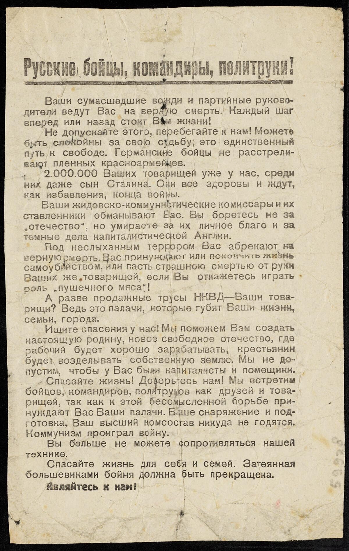 Duits pamflet in twee talen (Russisch en Duits). Het pamflet kan als vrijgeleide worden gebruikt door Russische soldaten die zich willen overgeven.