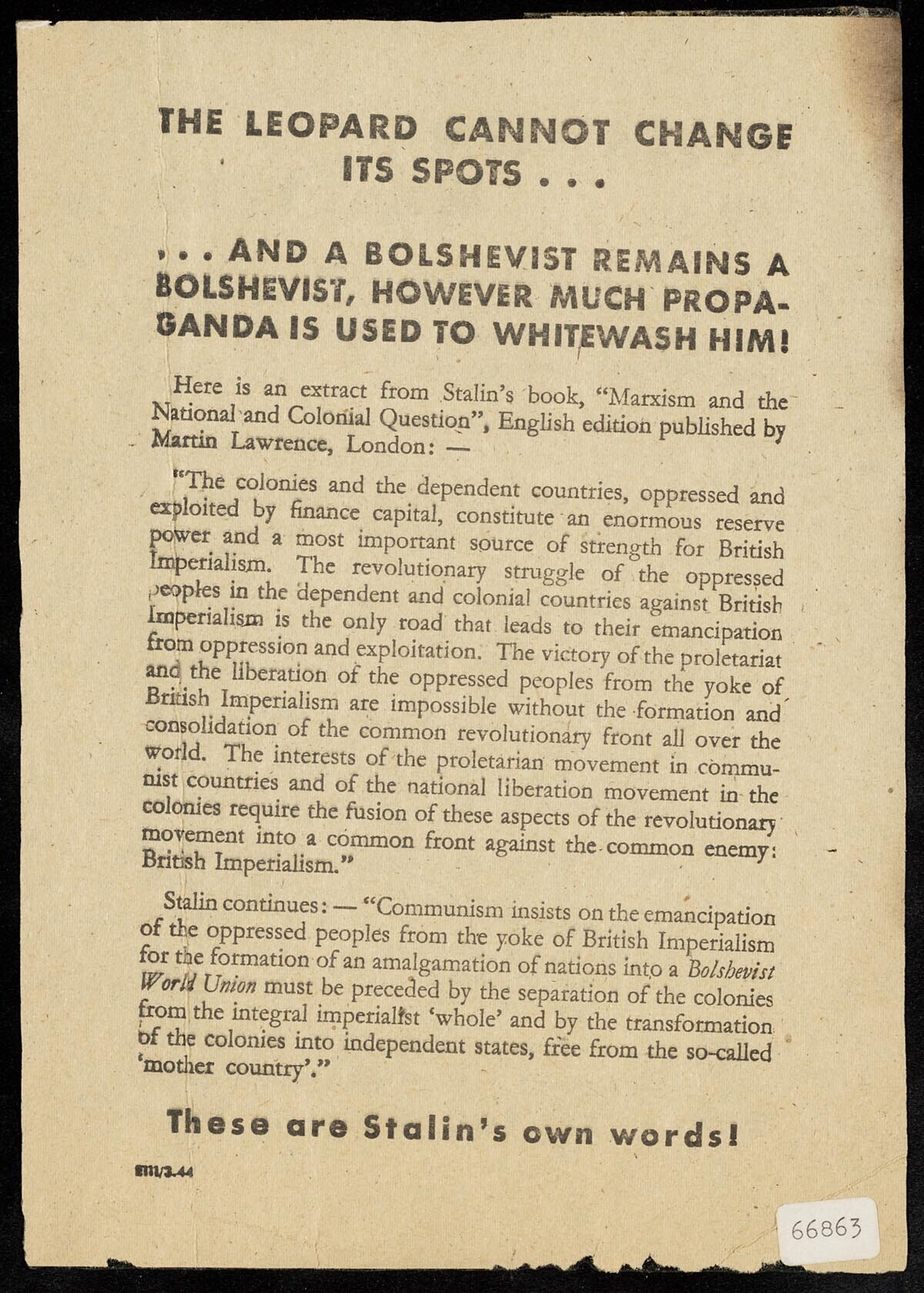 Duits (Engelstalig) pamflet waarin de Engelsen worden gewezen op Stalins plannen met betrekking tot het Britse wereldrijk. Op de achterzijde worden Britse politici geconfronteerd met eigen uitspraken over het bolsjewisme.