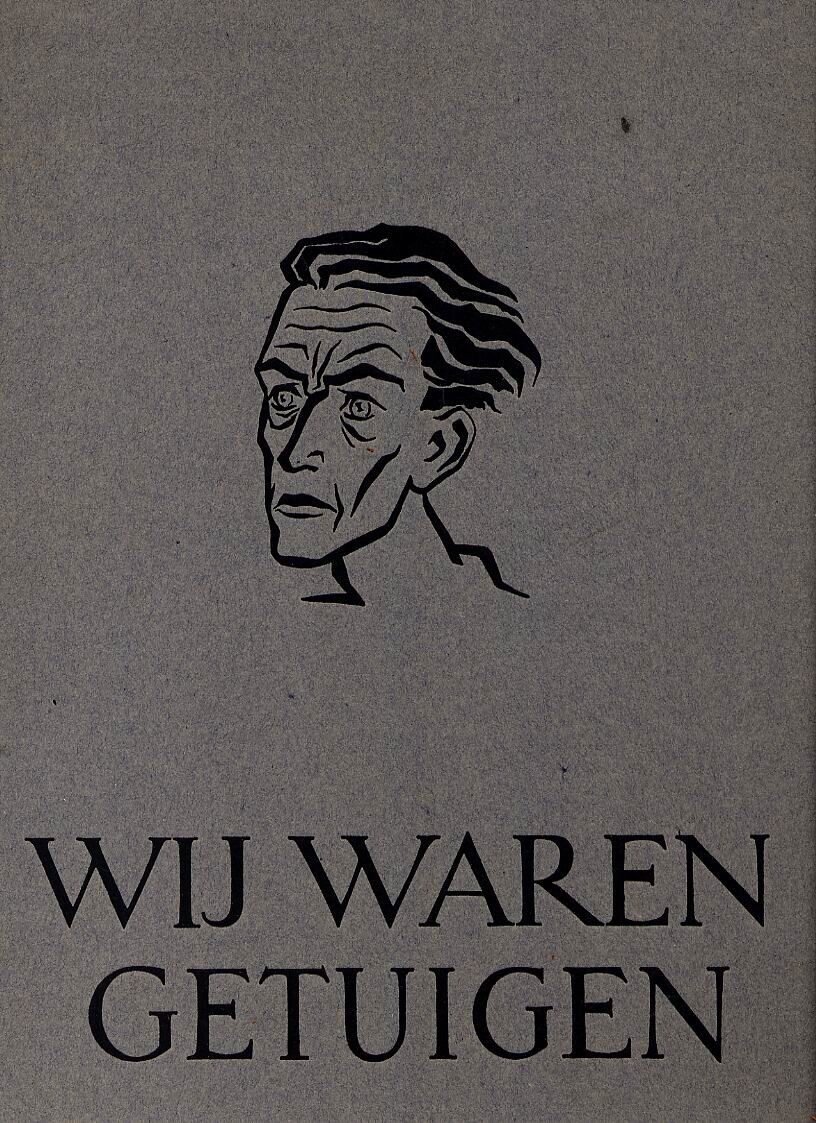 Ggebonden boek met op de grijze voorkant boven de titel een afbeelding van een magere mannenkop. Het boek bevat gedichten en zwartwit illustraties over vijf jaar bezetting en onderdrukking in Nederland.