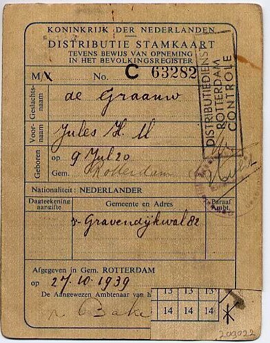 Distributie stamkaart afgegeven op 27 oktober 1939 te Rotterdam op naam van de heer J.H.M. de Graauw. Los toegevoegd een inlegvel voor het afhalen van bonkaarten.
