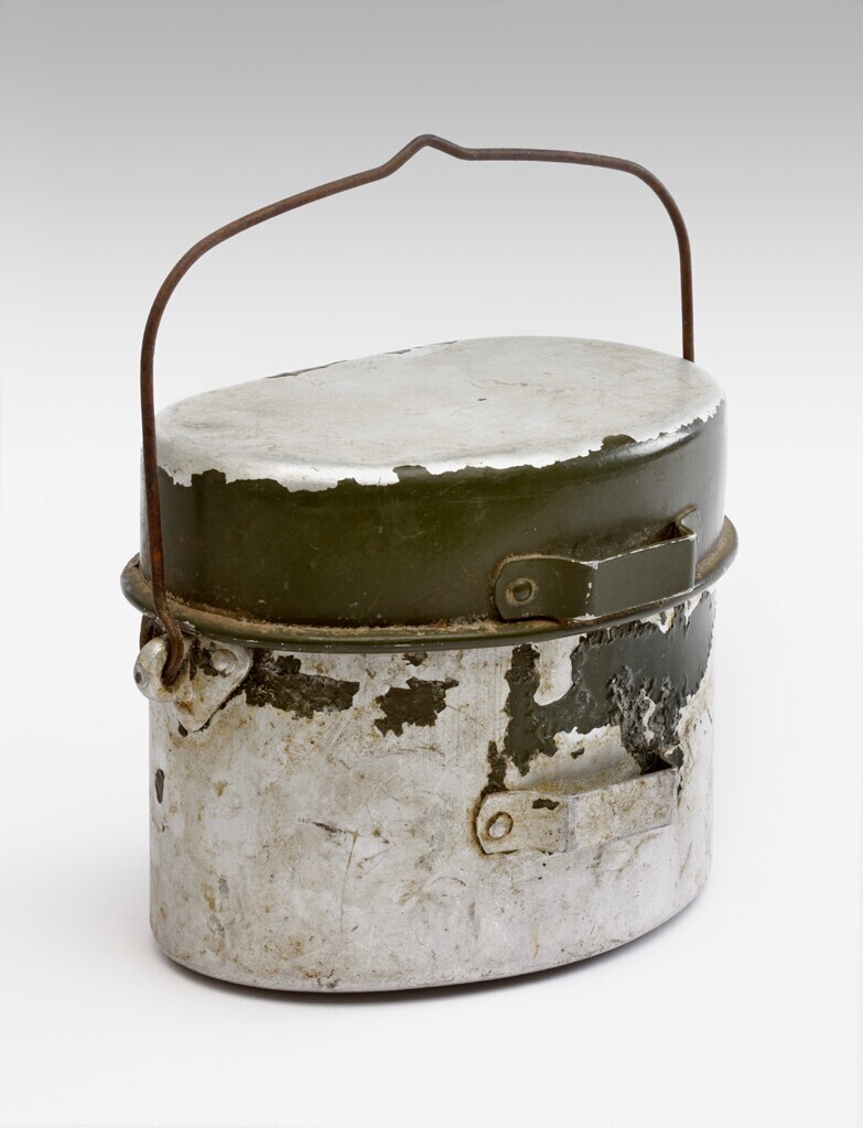 Een aluminium etensblik van het Duitse leger met ijzeren hengsel en aan de achterkant een beugel. Het etensblik was oorspronkelijk groen geverfd. Hiervan zijn nog enkele sporen zichtbaar.