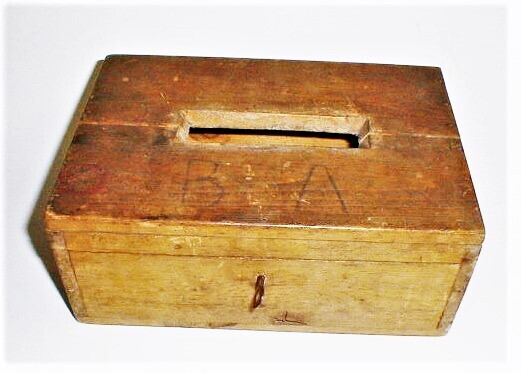 Houten kistje met in het deksel een gleuf. Gebruikt door een Leidse slager om distributiebonnen in te doen. Voorzien van een slot en sleutel.