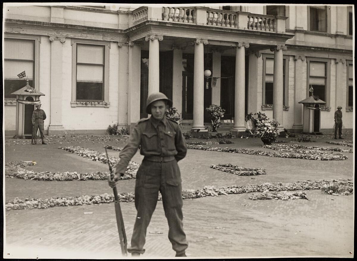 Vier foto's van de paleiswacht van de prinses Irene Brigade en een ansichtkaart met een tekening van hetzelfde tafereel.